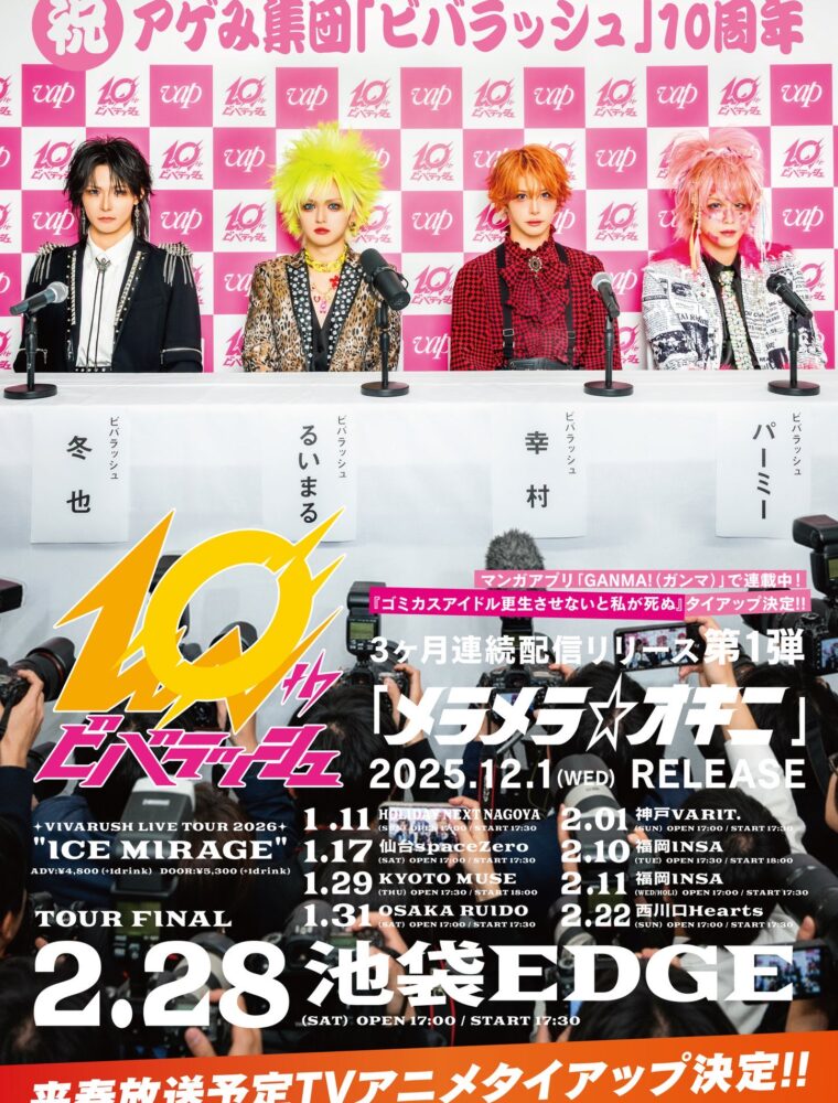 Instagram X YouTube Spotify NEWS ビバラッシュ10th ANNIVERSARY 2MAN LIVE -phase1-開催決定! ビバラッシュ LIVE TOUR 2026「ICE MIRAGE」開催決定! タワーレコードあべのHoop店にて「最強伝説」リリース記念企画決定! VIEW MORE INFO お客様へのお知らせ お客様へのお願い 撮影会新レギュレーションのご案内 グッズ等の不良品について 無料招待券配布終了のお知らせ スタンプカードについて LIVE&INSTORE 2025年11月06日(木)高田馬場CLUB PHASE 2025年11月10日(月)ホリネクカフェ 2025年11月11日(火)名古屋E.L.L. 2025年11月12日(水)池袋EDGE 2025年11月16日(日)東京 VIEW MORE 必ずお読みくださいお願いと注意事項