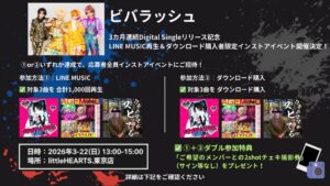 ビバラッシュ「メラメラ☆オキニ」「アゲマインド」「ウチのママがスピってる!!!!」をLINE MUSICで一定回数再生いただくか、iTunes・レコチョク・mora・Amazon Musicにてダウンロード購入いただいた方に、もれなく全員をインストアイベントにご招待!